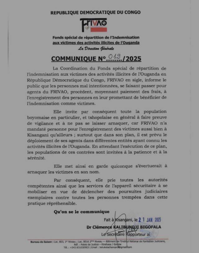 La Coordination du Fonds spécial de répartition de l’indemnisation aux victimes des activités illicites de l’Ouganda en République Démocratique du Congo, FRIVAO en sigle, informe le public que les personnes mal intentionnées, se faisant passer pour agents du FRIVAO, procèdent, moyennant paiement des frais, à l’enregistrement des personnes en leur promettant de bénéficier de l’indemnisation comme victimes.