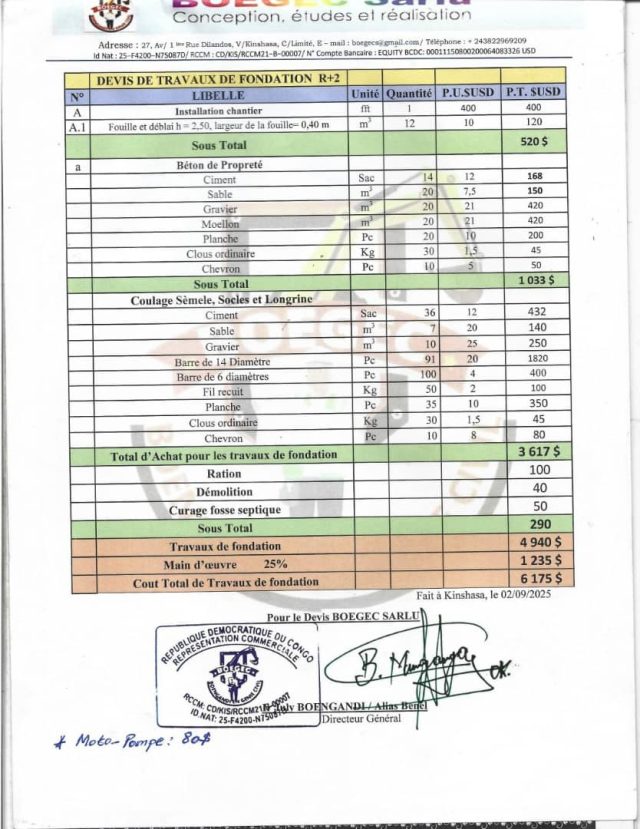 M. Platini ATSHANGOLA LILANGA explique que la plainte contre le Directeur Général de BOEGEC SARLU, une entreprise qui du reste a été contactée en premier lieu via Facebook, trouve son origine dans l’exécution insatisfaisante d’un contrat de construction. Il affirme avoir fait appel à l’entreprise BOEGEC SARLU pour la réalisation d’une fondation capable de soutenir un immeuble de type R+2. Le devis total pour ces travaux de fondation s’élevait à 6.175 dollars américains .